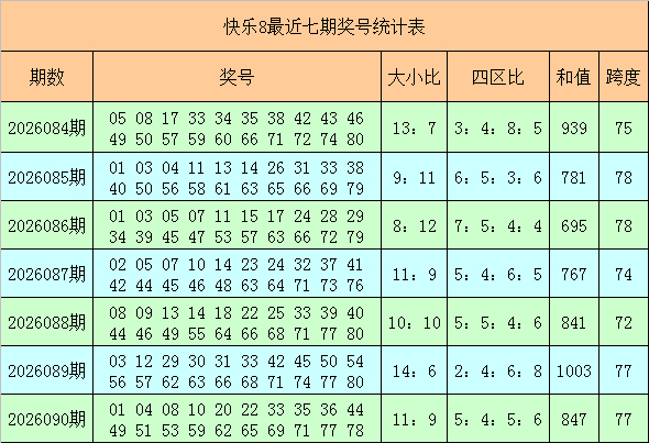 福彩快乐8第2026090期开出奖号:01 04 08 10 20 22 33 35 36 44 49 51 53 59 62 65 69 71 77 78,其中奖号大小比为11:9,四区比为5:4:5:6,和值为847,跨度为77。